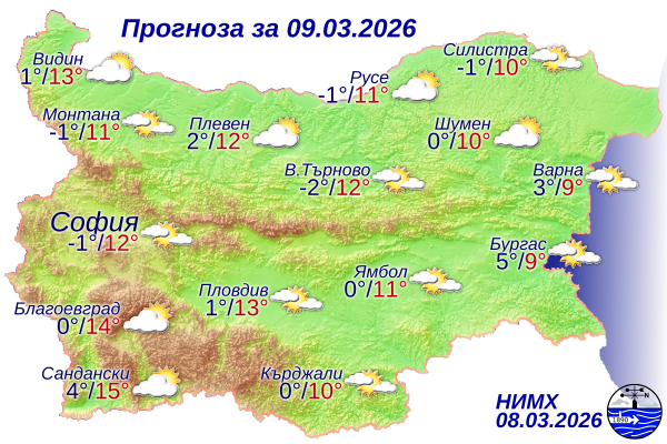 Днес ще преобладава слънчево време с временни увеличения на облачността. Ще духа слаб източен вятър. Максималните температури ще са между 10° и 15°, в София - около 12°.